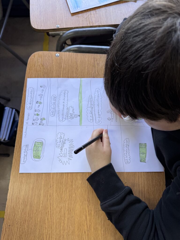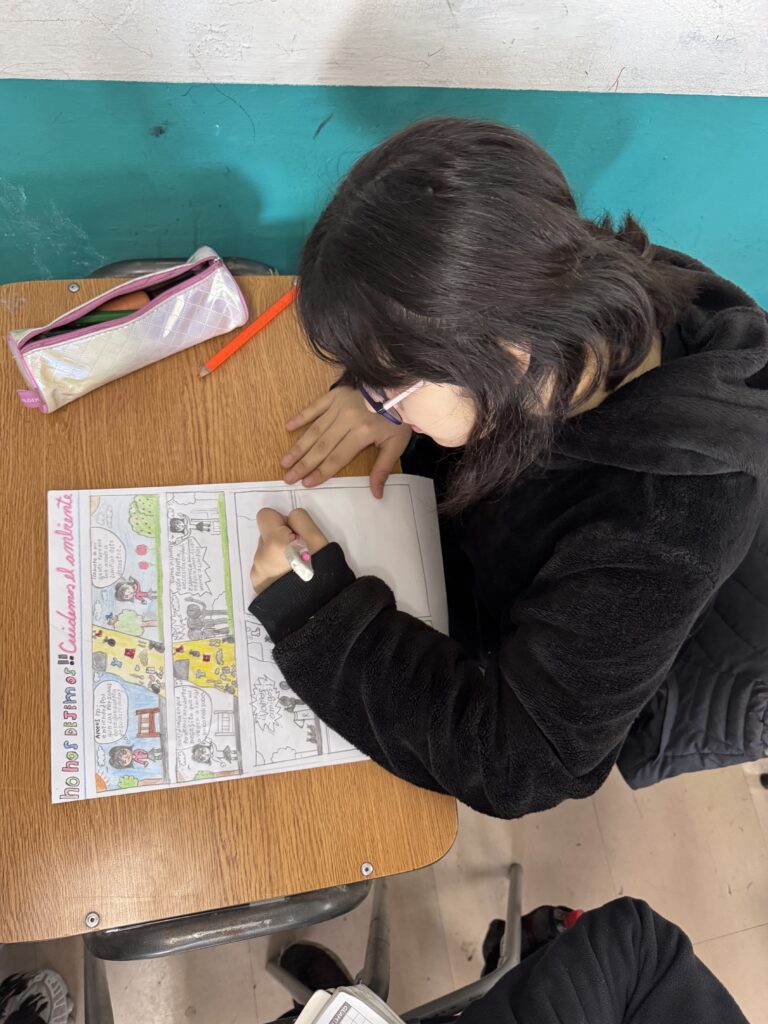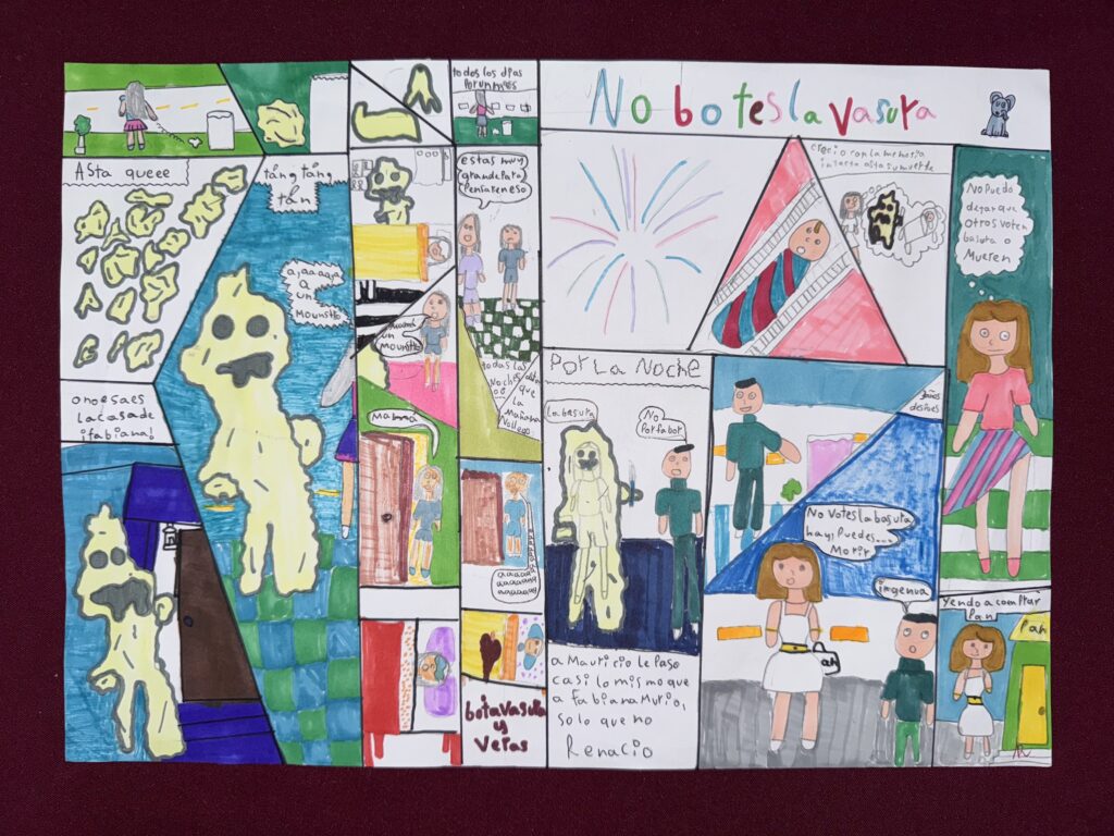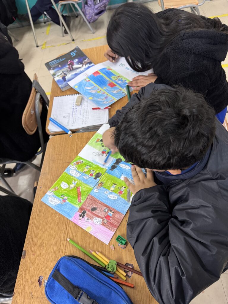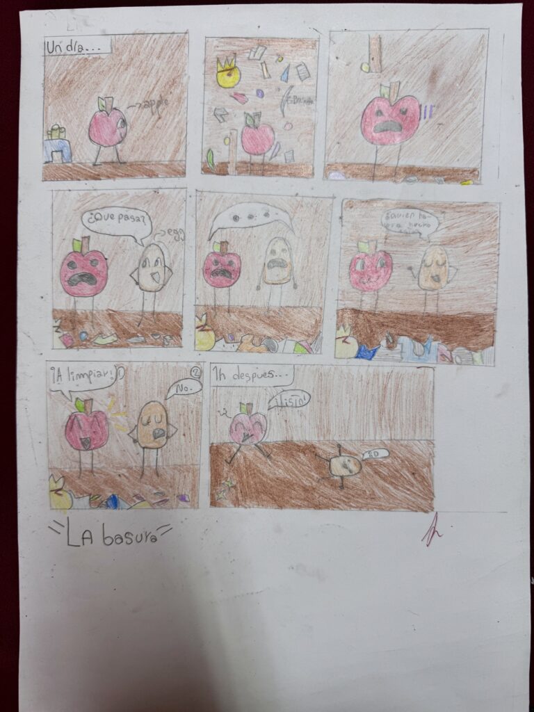 Los niños de quinto básico A y B crearon un cómic basado en la Unidad 3, que aborda la problemática del medio ambiente. Cada grupo plasmó en viñetas los impactos reales de la contaminación, junto con soluciones sostenibles. A través de personajes, diálogos y escenas cotidianas, lograron comunicar de manera clara la importancia de cuidar los ríos, reciclar y reducir el consumo de plásticos. El proyecto refleja esfuerzo, imaginación y un mensaje de responsabilidad ambiental para todos.